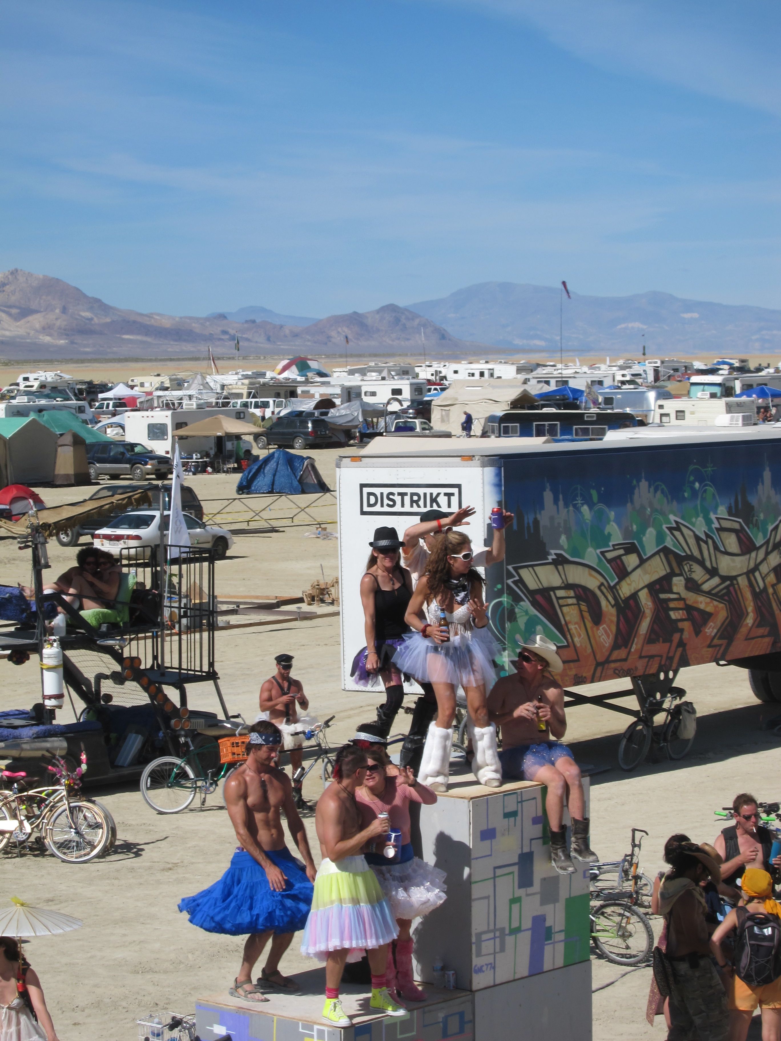 The next day, I was rambling around the city on foot when I saw their car approaching. I ran up and asked for a ride, and they recognized me and hailed me aboard. They were dancing on the car in a particularly sassy way, all dressed in different colors of tutus (it was tutu Tuesday, after all), really having a terrific time. I stayed with them for about an hour, and while I was watching them cavort, I realized that this wasn’t just about having fun dancing on a car you can drive while you’re drinking beer… This was their art car’s LAUNCH PARTY, and they were proud as hell to be driving around on something they had labored over for months beforehand. It’s wasn’t just a normal sexy playa dance, it was a victory dance. I said as much to a few of the people on the car, and they concurred. They eventually ended up over at Distrikt.