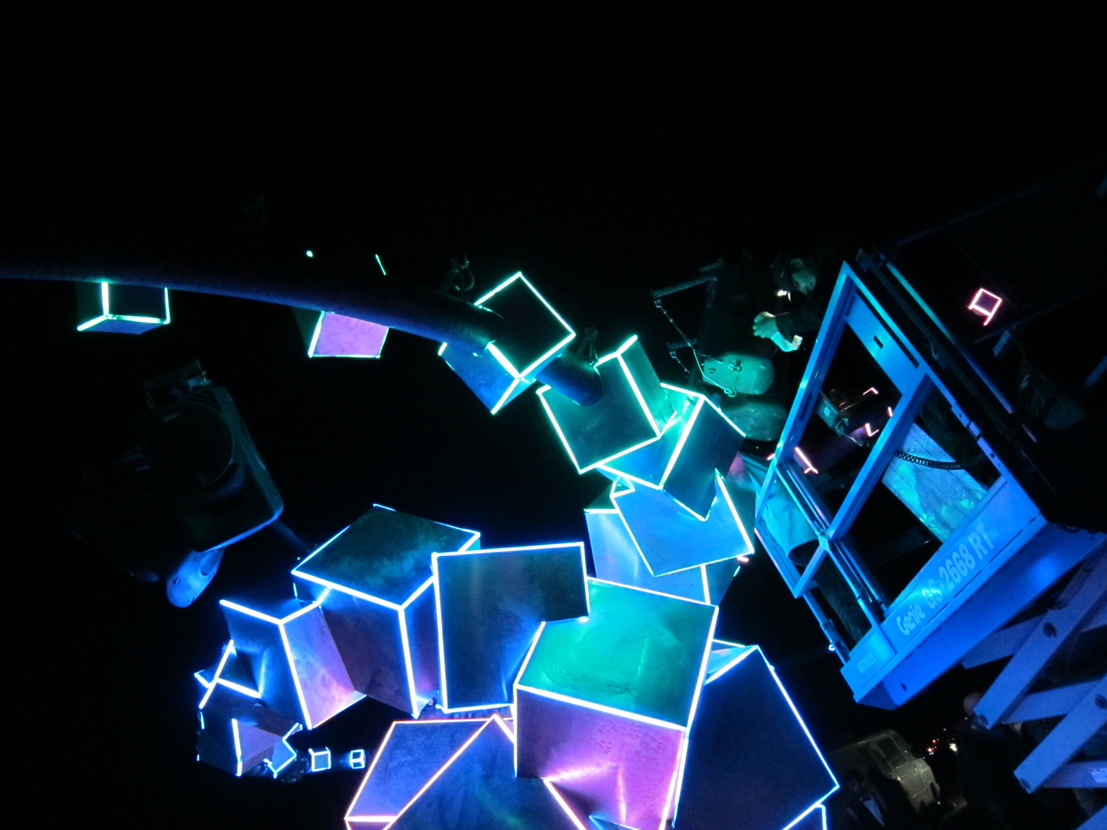 One of the first art pieces I saw was Syzygryd, which got an honorarium from the BurningMan organization, and then raised additional funds through KickStarter. I stared at it completely mesmerized, and the fire effects weren’t even going yet. In the photo below, you can see one small part of the sculpture itself, and someone working on a scissor lift fine-tuning things. The 60′ sculpture included a giant three-armed welded frame, color-changing lighting, three interactive touchscreen sound boards controllable by participants, sound, and (although I didn’t get to see it that night) fire effects. I suspect it was one of the more complex projects on the playa this year.